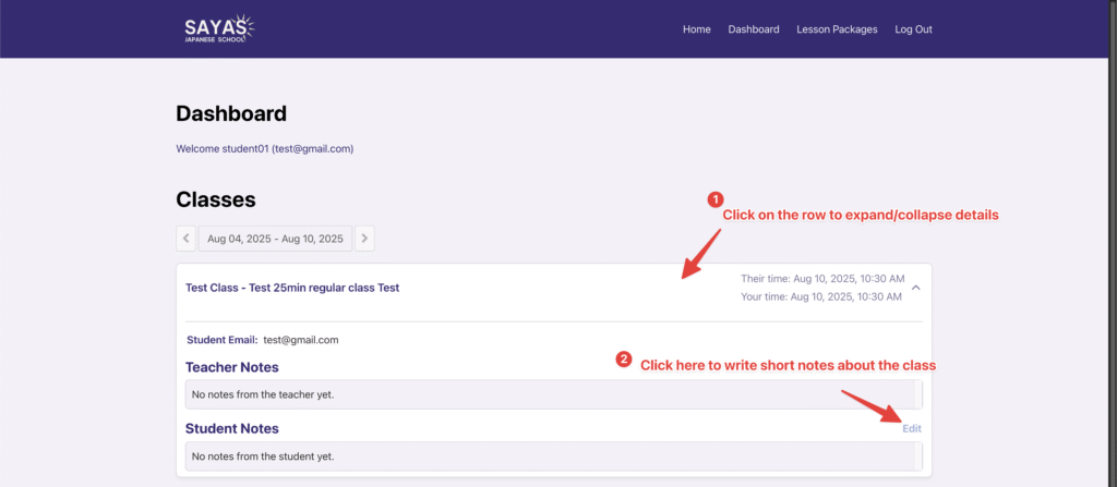 3. Click on the class to expand details and add class notes