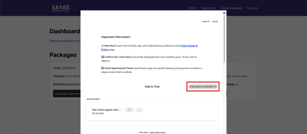 2. Click on Schedule Appointment and you will see the package code being applied automatically